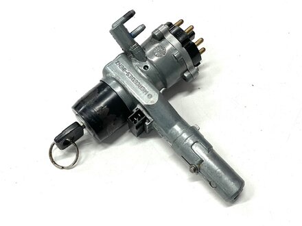 If you have a stuck key or failed lock in your 1977 to 1979 W123 this is your best option for a reliable replacement but we only have ONE of these in stock AND IT IS USED. The exact originals as shown in the picture below are no longer made. These do not have a replaceable tumbler assembly. But the newer style here will fit and work perfectly in your early W123 with only one modification ( very small). You will have to remove the aluminum ring in the keyhole for this unit to fit through the dash. ( See second picture below: This unit comes with the vacuum engine shut-iff switch and the vacuum switch cam installed. The switch for the door buzzer is also included. It only comes with one good key and is ready to install.