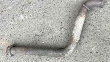If you have a 617 turbo diesel you could have a broken flex down pipe. This is the pipe that comes out of the back of the engine. There is no good way to fix this. You will need to replace with new or good used.