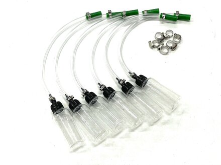 The bottles are vented at the top lip to prevent pressure build-up. Attachment is via a push-on silicone tube and hose clamps as shown below. The included on-demand video instructions provide examples of how to use this kit.