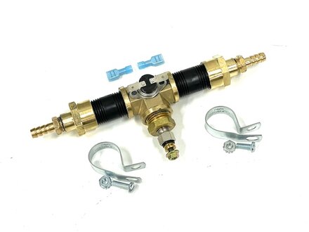Kent calls this his "flowglow" because it is a straight flow-through fuel heater that uses a glow plug to produce the heat. Since the glow plug is submerged in vegetable oil fuel, it is very efficient and will last a long time. WARNING: If you turn it on with no fuel in the heater and leave it on for a long period, you will burn out the glow plug. The unit must be firmly grounded to the car's chassis to complete the electrical circuit. Do not use rubber mounts. You must use the metal mounts supplied and make certain that what you are mounting it to has a good ground connection to the chassis.