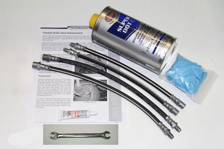 Our flexible brake hose kit includes front brake hoses, rear brake hoses, 1 liter high performance brake fluid, 9x11 mm Flare nut wrench, thread sealant, three pairs of nitrile gloves, and complete pictorial instructions. Fits all 240D 300D 300TD and 300CD 1981 to 1985 and all 126 sedans and SEC coupes 1981 to 1991.